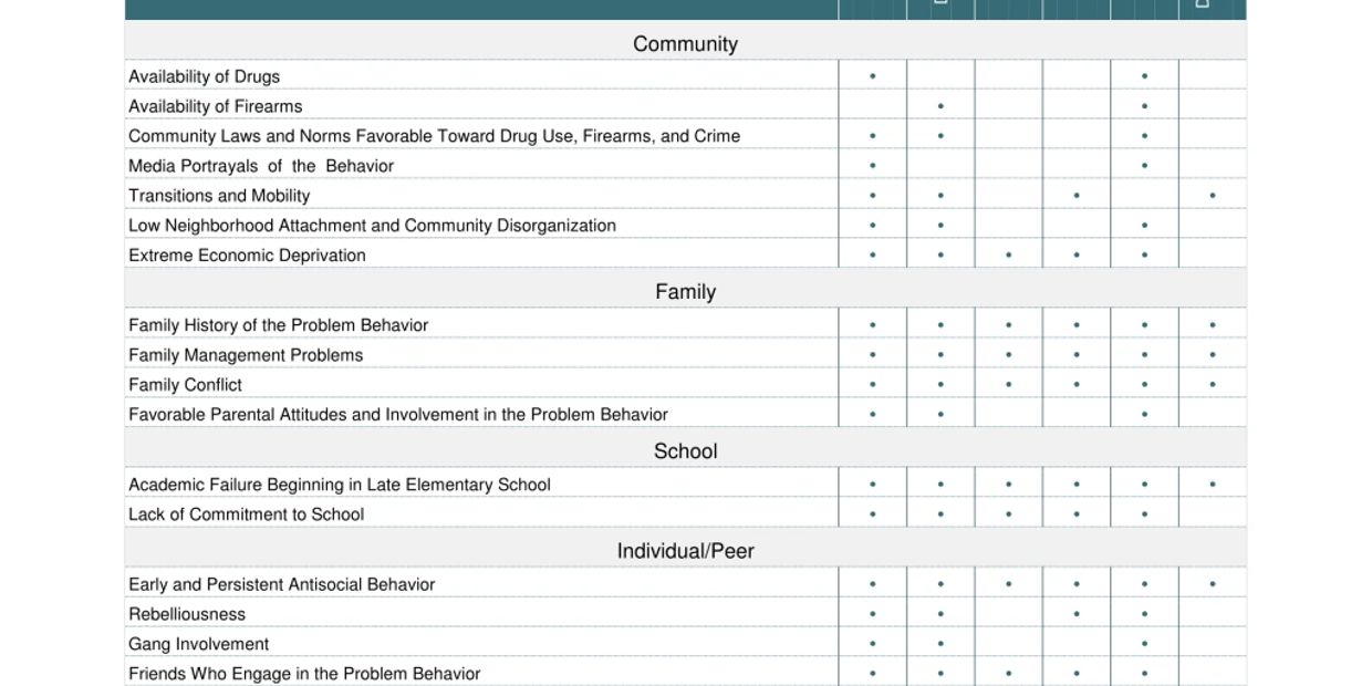 The 20 risk factors that CTC focuses on were identified after examining hundreds of studies across 30 years. Risk factors were selected when two or more long-term, high-quality studies indicated that a particular factor contributed to a problem behavior. The chart above shows the CTC risk factors, along with the youth problem behaviors each factor is associated with. CTC focuses on risk factors because evidence has shown that lessening the impact of these risk factors lowers rates of youth problem behaviors.